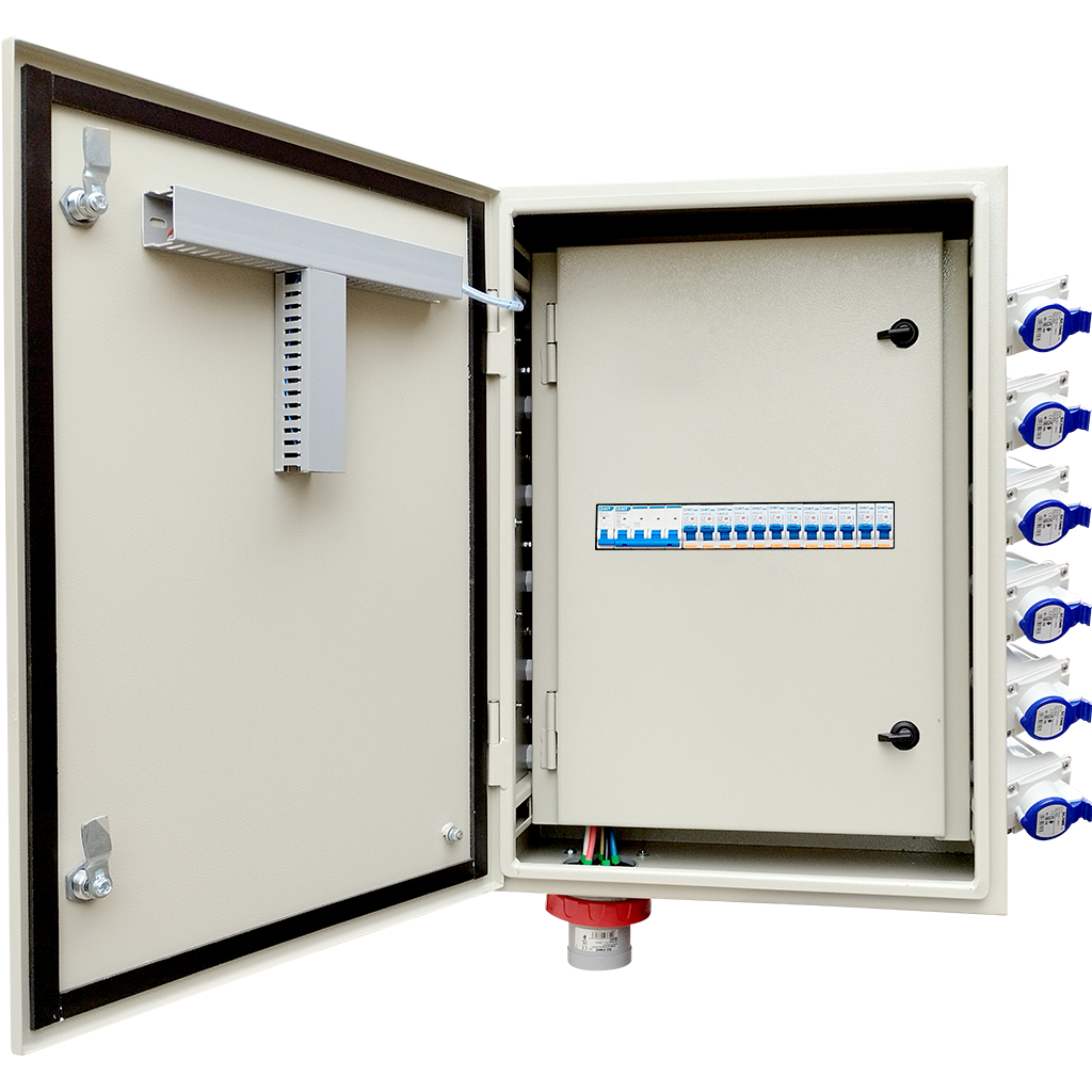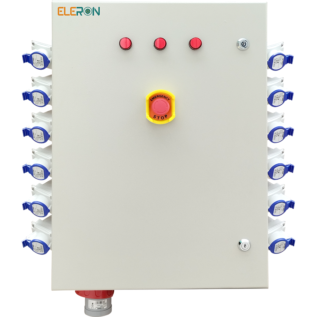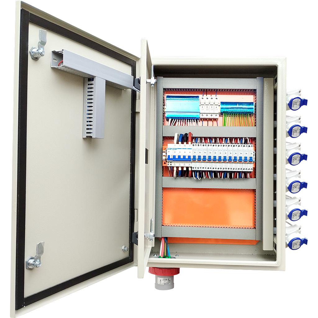 TABLERO FAENA EVENTOS 63A  de distribución para uso industrial, eventos y de obras, armado con protecciones CHINT y conectores SCAME. Diseñado para alimentar y proteger hasta doce circuitos monofásicos de 16 A  RCBO, con parada de emergencia mediante bobina de disparo. Listo para certificar esta bajo norma chilena SEC. Tablero bajo norma SEC (100% Certificable T1).