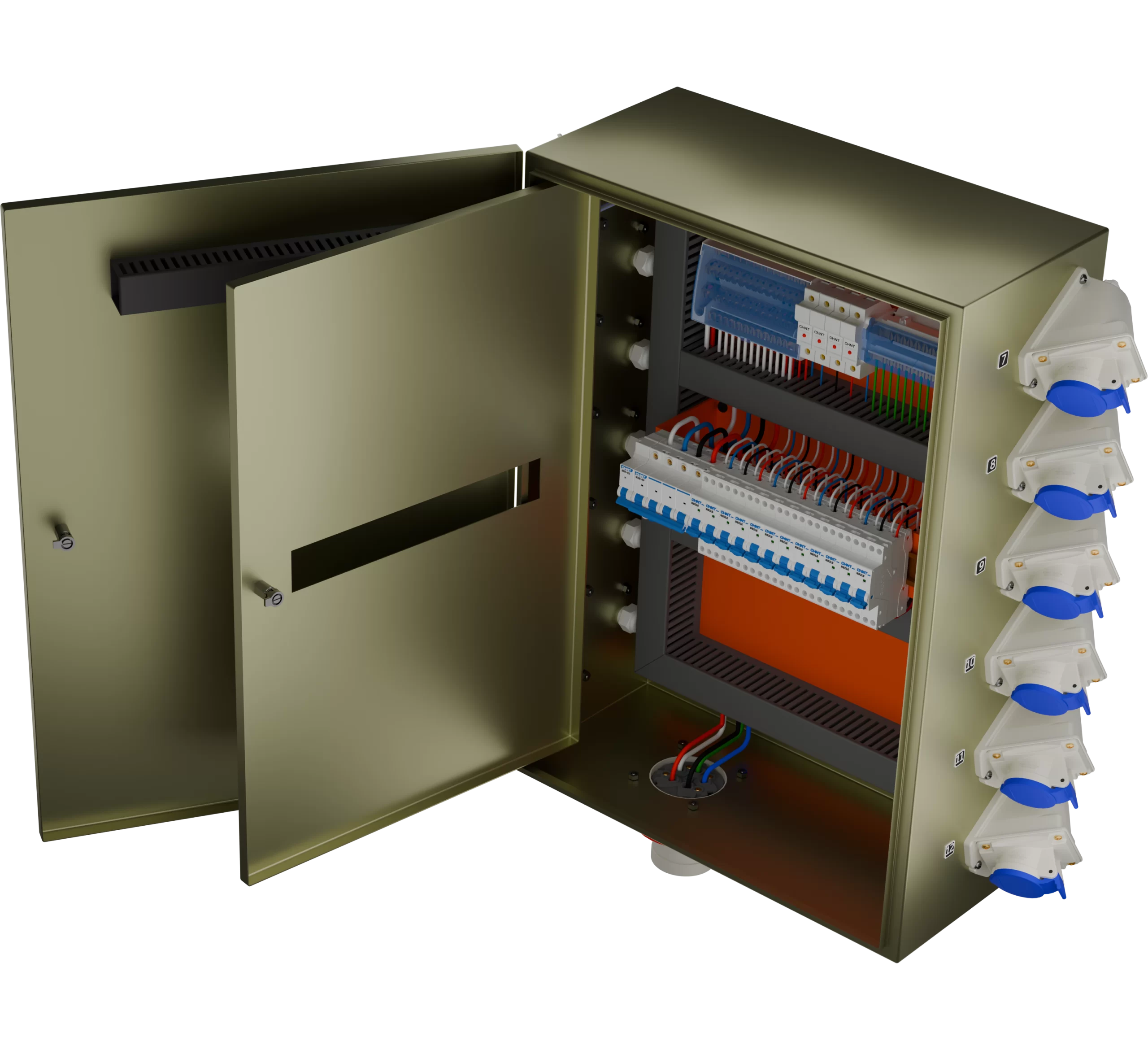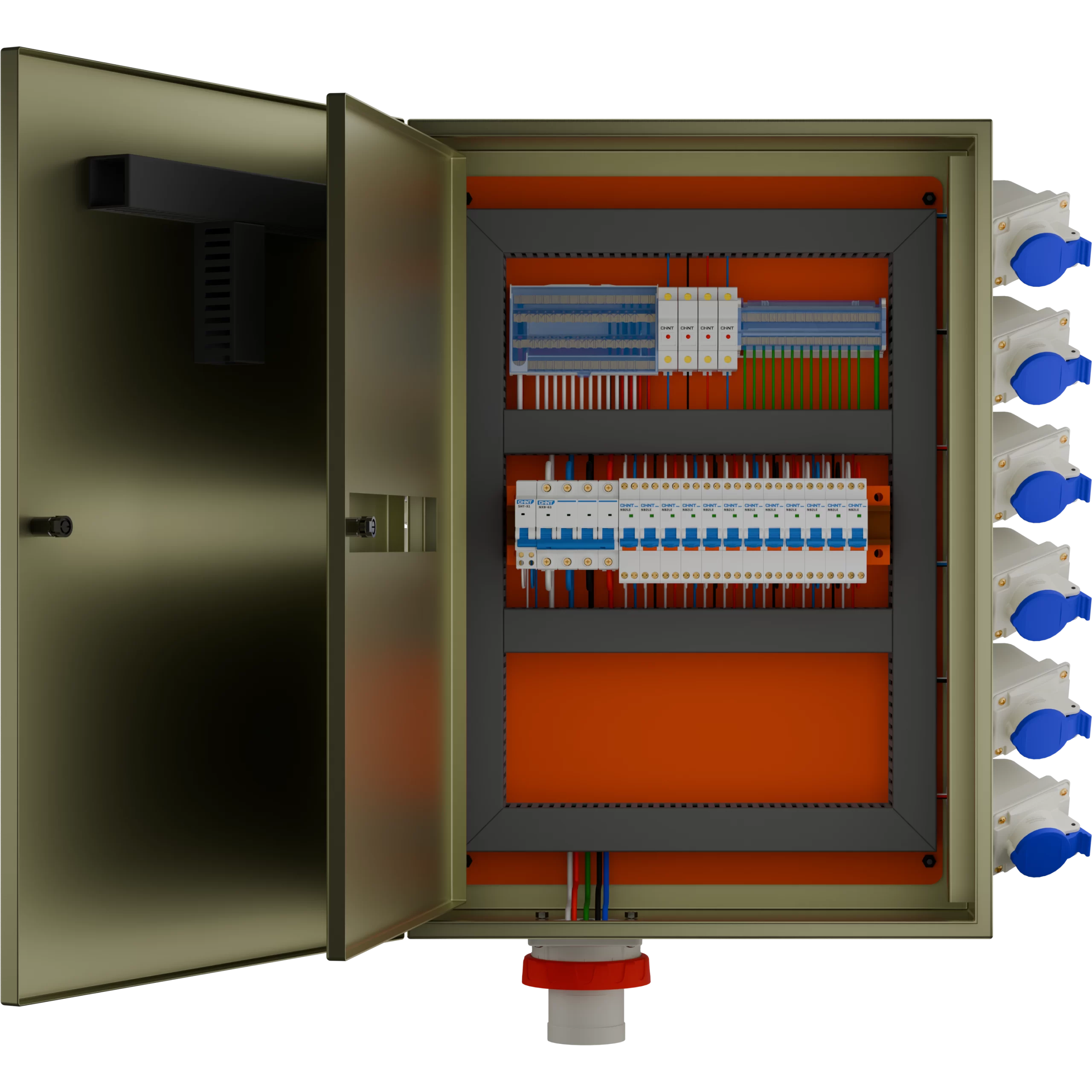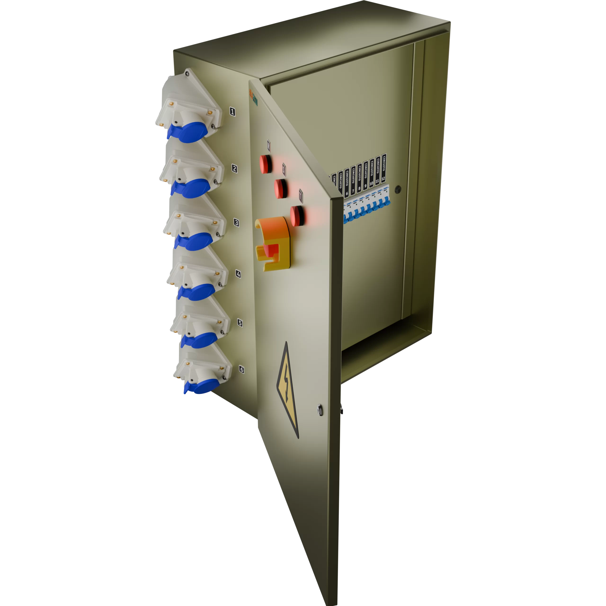 TABLERO FAENA EVENTOS 63A  de distribución para uso industrial, eventos y de obras, armado con protecciones CHINT y conectores SCAME. Diseñado para alimentar y proteger hasta doce circuitos monofásicos de 16 A  RCBO, con parada de emergencia mediante bobina de disparo. Listo para certificar esta bajo norma chilena SEC. Tablero bajo norma SEC (100% Certificable T1).